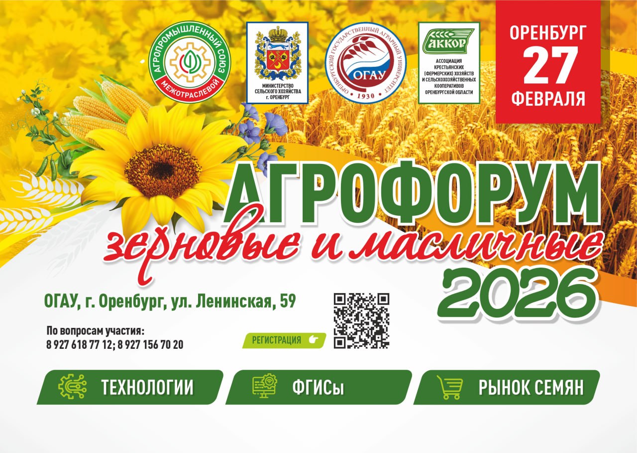 Агрофорум «Зерновые и масличные — технологии, ФГИСы, рынок семян» состоится 27 февраля на базе Оренбургского государственного аграрного университета. Эксперты расскажут, как в сложных условиях аграриям увеличить прибыль.